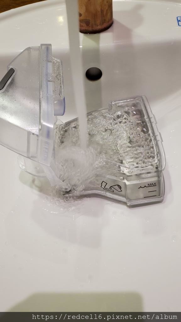 【▼】使用清水來清潔科林睡得美正壓呼吸器專用水盒。